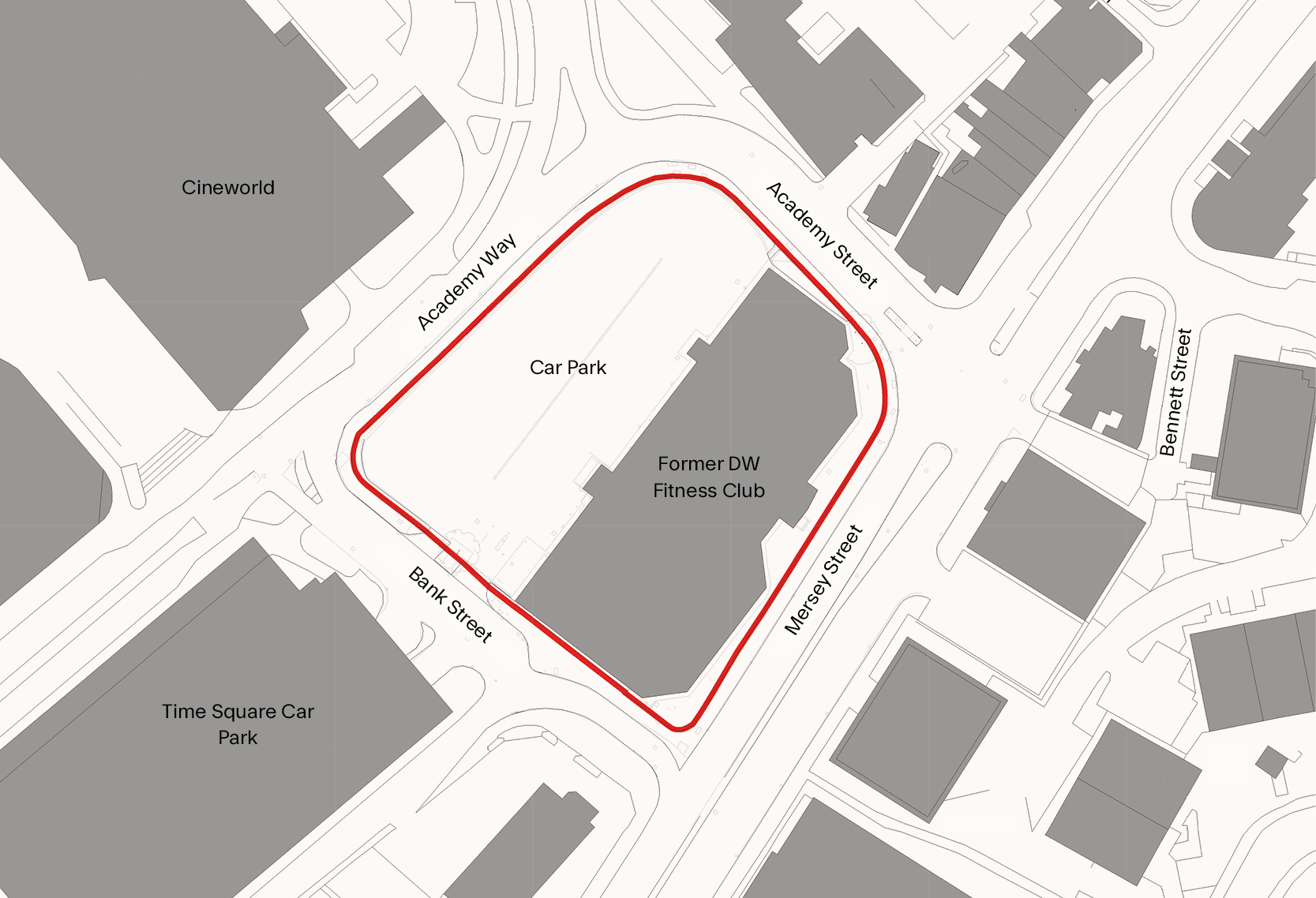 The site is bound by Academy Street to the north east, Academy Way to the north west, Bank Street to the south west and Mersey Street to the south east. The site was redeveloped in the 1980s as a retail unit fronting a realigned Mersey Street and a surface level car park facing Academy Way. Previous occupiers include Texas DIY, JJB Sports and most recently DW Fitness Club. The unit and car park are currently unoccupied.